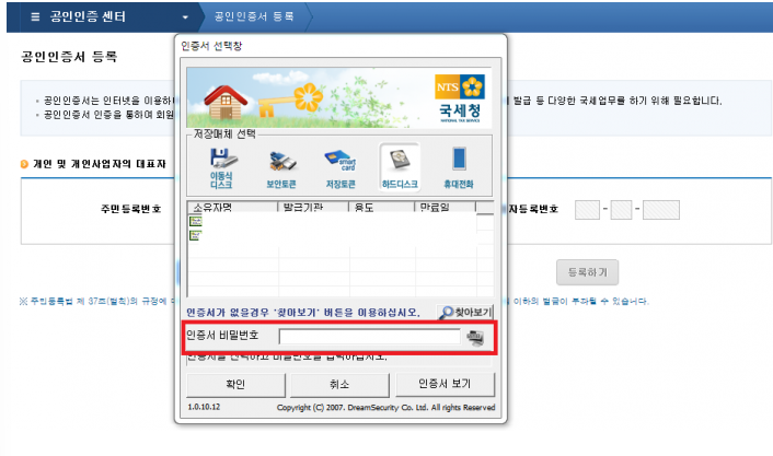 등록하려는 해당 공인인증서의 비밀번호를 입력하고 확인 버튼을 눌러주세요